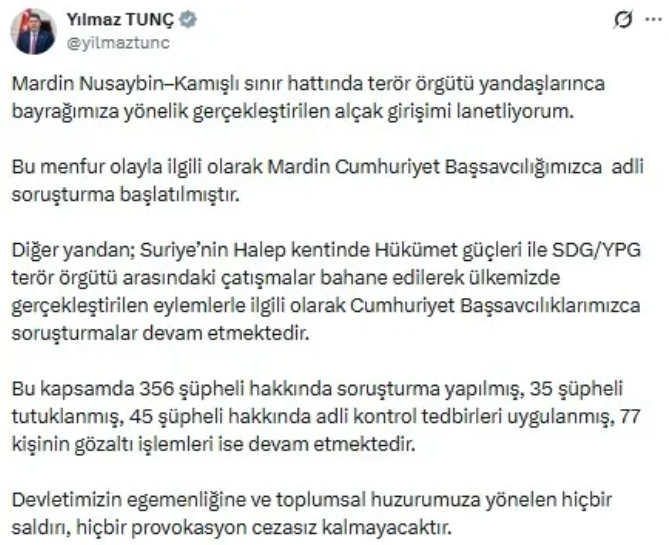 Adalet Bakanı Yılmaz Tunç "Mardin Nusaybin–Kamışlı sınır hattında terör örgütü yandaşlarınca bayrağımıza yönelik gerçekleştirilen alçak girişimi lanetliyorum. Bu menfur olayla ilgili olarak Mardin Cumhuriyet Başsavcılığımızca adli soruşturma başlatılmıştır." açıklamasını yaptı.