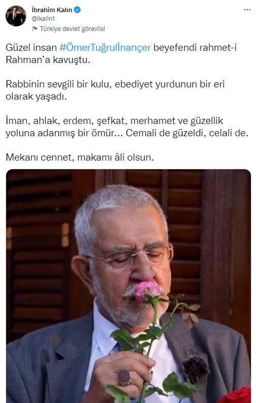Cumhurbaşkanlığı Sözcüsü İbrahim Kalın sosyal medya hesabından yaptığı paylaşımda "Güzel insan Ömer Tuğrul İnançer beyefendi rahmet-i Rahman'a kavuştu. Rabbinin sevgili bir kulu, ebediyet yurdunun bir eri olarak yaşadı. İman, ahlak, erdem, şefkat, merhamet ve güzellik yoluna adanmış bir ömür... Cemali de güzeldi, celali de. Mekanı cennet, makamı âli olsun." ifadelerine yer verdi.