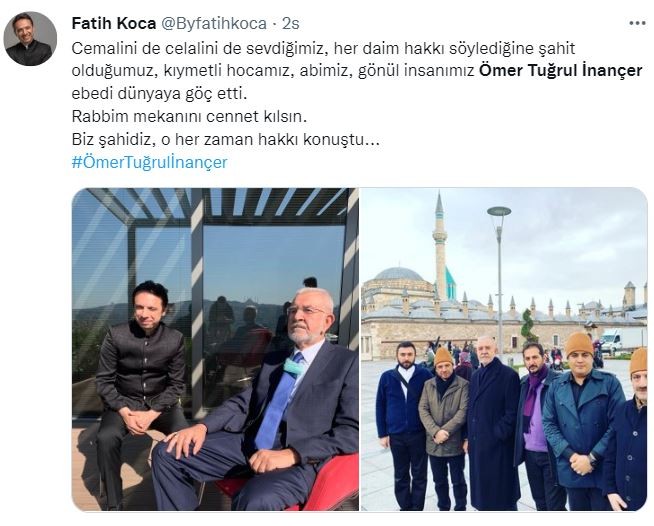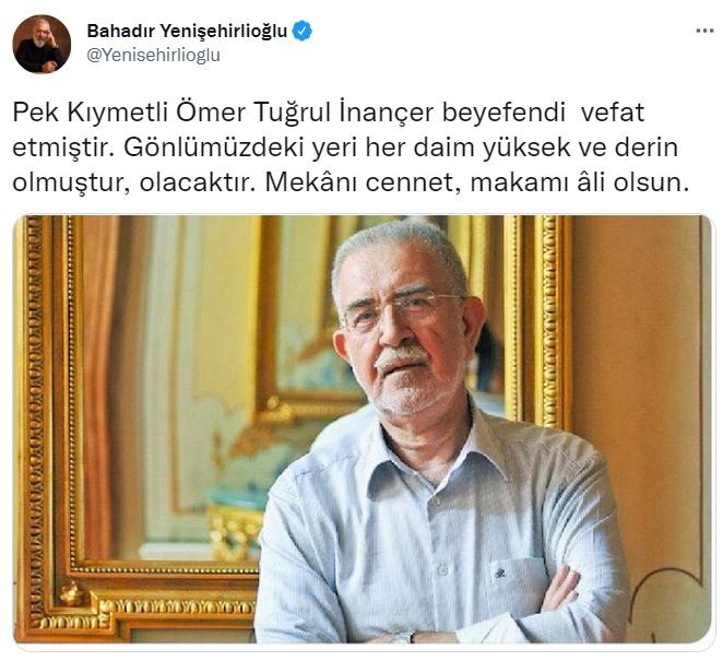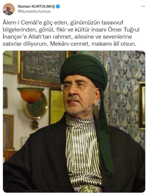 AK Parti Genel Başkanvekili Numan Kurtulmuş, "Âlem-i Cemâl'e göç eden, günümüzün tasavvuf bilgelerinden, gönül, fikir ve kültür insanı Ömer Tuğrul İnançer’e Allah'tan rahmet, ailesine ve sevenlerine sabırlar diliyorum. Mekânı cennet, makamı âlî olsun." mesajını paylaştı.