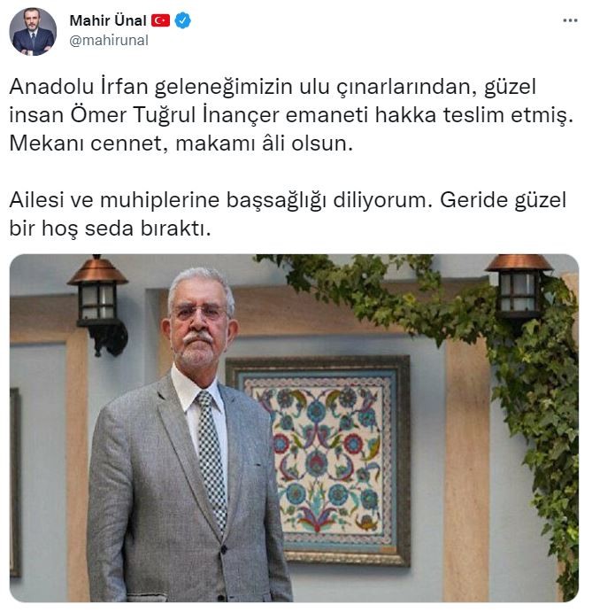 AK Parti Grup Başkanvekili Mahir Ünal: Anadolu İrfan geleneğimizin ulu çınarlarından, güzel insan Ömer Tuğrul İnançer emaneti hakka teslim etmiş. Mekanı cennet, makamı âli olsun. Ailesi ve muhiplerine başsağlığı diliyorum. Geride güzel bir hoş seda bıraktı.