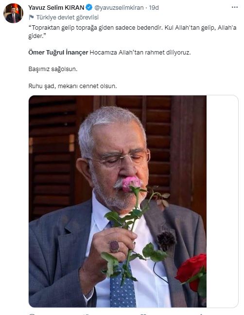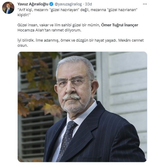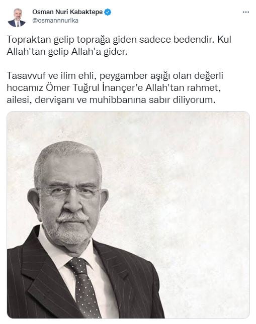 AK Parti İstanbul İl Başkanı Osman Nuri Kabaktepe: Topraktan gelip toprağa giden sadece bedendir. Kul Allah'tan gelip Allah'a gider. Tasavvuf ve ilim ehli, peygamber aşığı olan değerli hocamız Ömer Tuğrul İnançer'e Allah'tan rahmet, ailesi, dervişanı ve muhibbanına sabır diliyorum.