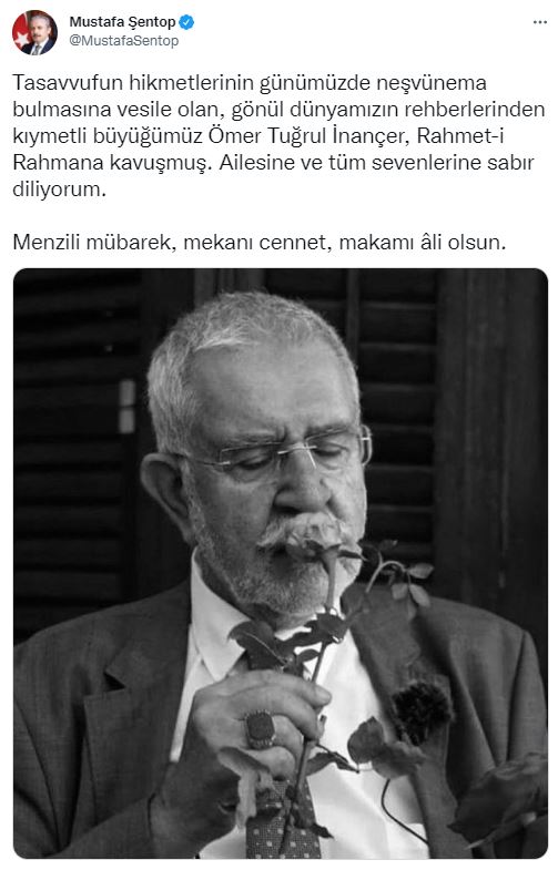 Türkiye Büyük Millet Meclisi Başkanı Mustafa Şenteop: Tasavvufun hikmetlerinin günümüzde neşvünema bulmasına vesile olan, gönül dünyamızın rehberlerinden kıymetli büyüğümüz Ömer Tuğrul İnançer, Rahmet-i Rahmana kavuşmuş. Ailesine ve tüm sevenlerine sabır diliyorum. Menzili mübarek, mekanı cennet, makamı âli olsun.