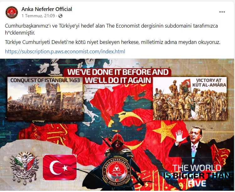 The Economist'in sitesine sızan Anka Neferler, İngiliz derginin sitesine "The Economist ayağını denk al" mesajını yazdı. Bu mesajla birlikte, görselde İstanbul'un Fethi, İngilizlerin Türkler tarafından esir alındığı Kut'ül Amare Zaferi, Türk Bayrağı, Osmanlı Devleti Arması ile haritası ve "Dünya 5'ten büyüktür" ifadesiyle beraber Cumhurbaşkanı Erdoğan'ın fotoğrafı paylaşıldı. Ayrıca görselde, İngilizce olarak "Daha önce yaptıklarımızı tekrar yapacağız" ifadesi yer aldı.