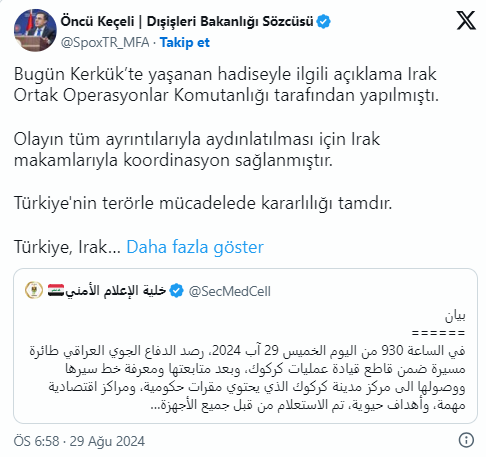 Keçeli, X sosyal medya hesabından yaptığı açıklamada, Kerkük'te yaşanan olayla ilgili Irak Ortak Operasyonlar Komutanlığı tarafından açıklama yapıldığını belirtti.