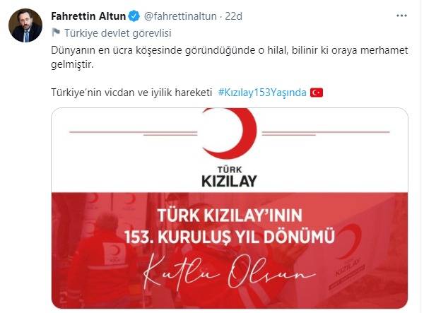 İletişim Başkanı Fahrettin Altun sosyal medya hesabından yaptığı paylaşımla, insanın hayatını ve sağlığını korumak, ihtiyaç anında dayanışmanın, ıstırap anında eşitliğin, savaşın en kızgın anında insancıllığın, tarafsızlığın ve barışın simgesi haline gelen Türk Kızılay'ının kuruluş yıl dönümünü kutladı. Altun paylaşımında, “Dünyanın en ücra köşesinde göründüğünde o hilal, bilinir ki oraya merhamet gelmiştir. Türkiye’nin vicdan ve iyilik hareketi #Kızılay153Yaşında” ifadelerini kullandı.