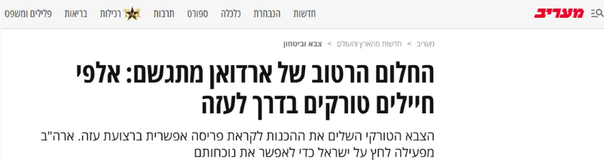 Maariv gazetesi, "Erdoğan'ın en büyük hayali gerçekleşiyor: Binlerce Türk askeri Gazze'ye doğru yolda" başlıklı dikkat çeken bir diğer haberinde, Türk ordusunun, Gazze Şeridi'nde olası bir konuşlanmaya yönelik hazırlıklarını tamamladığını ve ABD'nin, İsrail'e Türk askerlerinin varlığına izin vermesi için baskı yaptığını yazdı.