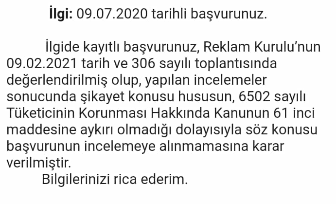 "İlgide kayıtlı başvurunuz, Reklam Kurulu'nun 09.02.2021 tarih ve 306 sayılı toplantısında değerlendirilmiş oplu, yapılan incelemeler sonucunda şikayet konusu hususun, 6502 sayılı Tüketici Korunması Hakkında Kanunun 61. maddesine aykırı olmadığı dolayısıyla söz konusu başvurunun incelemeye alınmamasına karar verilmiştir. Bilgilerinizi rica ederim."