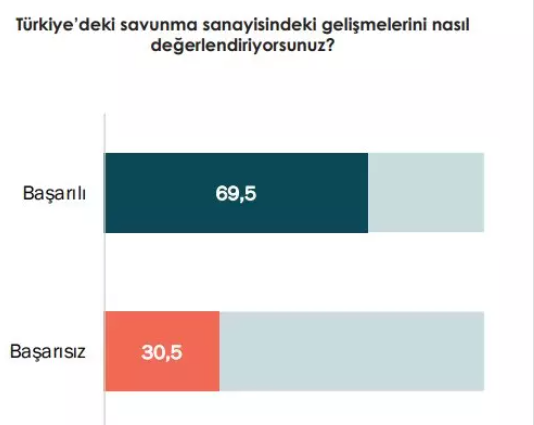 Areda Survey tarafından 29-30 Mayıs 2025 tarihlerinde gerçekleştirilen ve 3.275 kişinin katıldığı araştırmaya göre, katılımcıların %69,5'i Türkiye'nin savunma sanayisindeki gelişmeleri başarılı bulurken, %30,5'i ise başarısız olarak değerlendirdi.