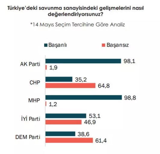 AK Parti seçmenlerinin %98,1'i ve MHP seçmenlerinin %98,8'i savunma sanayisindeki gelişmeleri başarılı buldu.