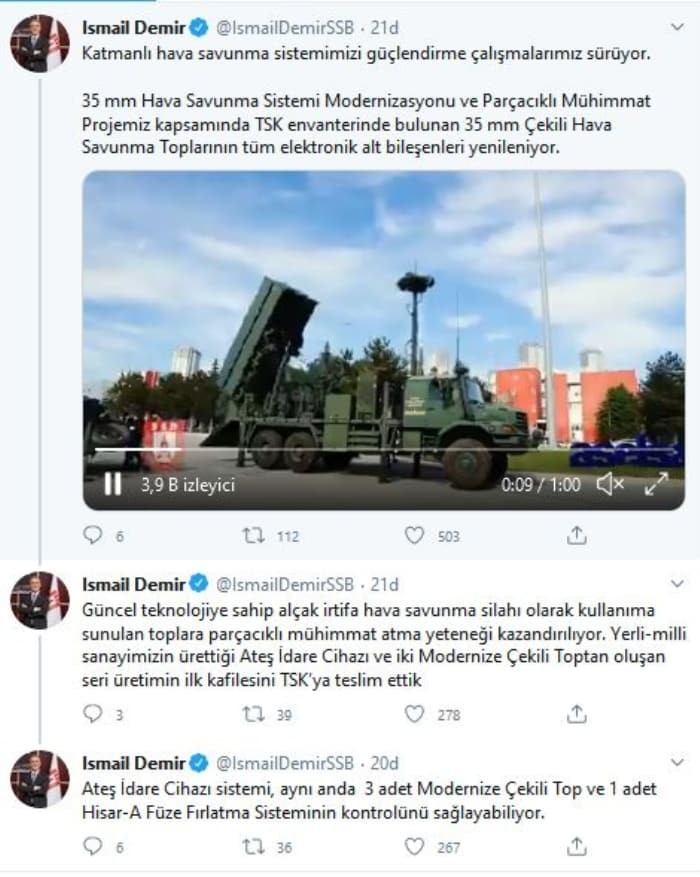 "Katmanlı hava savunma sistemimizi güçlendirme çalışmalarımız sürüyor. 35 mm Hava Savunma Sistemi Modernizasyonu ve Parçacıklı Mühimmat Projemiz kapsamında TSK envanterinde bulunan 35 mm Çekili Hava Savunma Toplarının tüm elektronik alt bileşenleri yenileniyor.