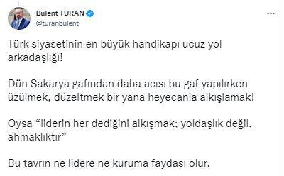 Çanakkale Milletvekili Bülent Turan, “Türk siyasetinin en büyük handikapı ucuz yol arkadaşlığı! Dün Sakarya gafından daha acısı bu gaf yapılırken üzülmek, düzeltmek bir yana heyecanla alkışlamak! Oysa ‘liderin her dediğini alkışmak; yoldaşlık değil, ahmaklıktır’ Bu tavrın ne lidere ne kuruma faydası olur” diye konuştu.