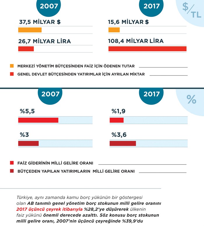 Türkiye’de son 10 yılda genel devlet gelirleri 6 trilyon 355 milyar lirayı bulurken, genel faiz dışı gider 6 trilyon 40 milyar lira, faiz dahil genel toplam gider de 6 trilyon 611 milyar lira oldu. Türkiye, aynı zamanda kamu borç yükünün bir göstergesi olan AB tanımlı genel yönetim borç stokunun milli gelire oranını da 2017’nin üçüncü çeyreği itibarıyla yüzde 28,2’ye düşürerek ülkenin faiz yükünü önemli derecede azalttı.