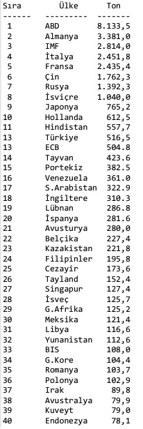 Dünya Altın Konseyi (World Gold Council) tarafından açıklanan verilerine göre, 2015 yılı 4. çeyrek sonu itibariyle ABD 8.133,5 ton rezervle ilk sırada yer alırken, Almanya 3.381,0 ton ile ikinci sırada, IMF 2.814,0 ton ile üçüncü sırada bulunuyor.
