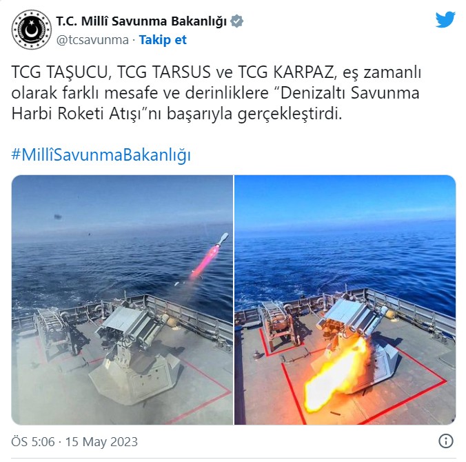 Milli Savunma Bakanlığının sosyal medya hesabından bir paylaşım yaptı. Yapılan paylaşımda, "TCG TAŞUCU, TCG TARSUS ve TCG KARPAZ, eş zamanlı olarak farklı mesafe ve derinliklere "Denizaltı Savunma Harbi Roketi Atışı"nı başarıyla gerçekleştirdi" ifadeleri ile yer aldı.