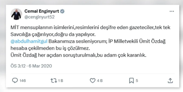 Aynı Cemal Enginyurt, 5 yıl önce 2020 yılında dönemin Adalet Bakanı Abdülhamit Gül’e Ümit Özdağ’ı şikayet ederek hedef göstermişti.