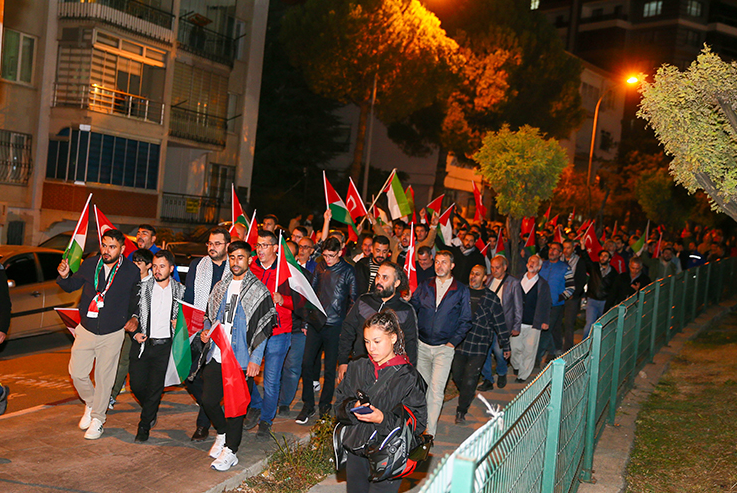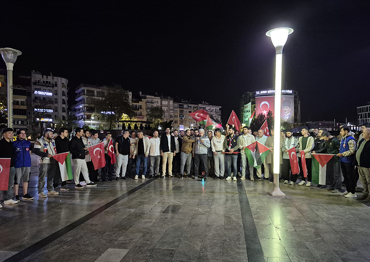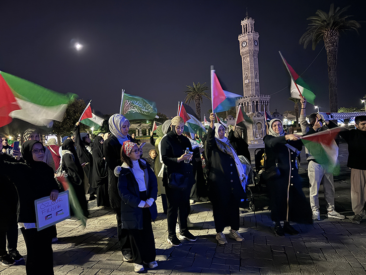 İzmir'de Konak Meydanı'ndan toplanan çok sayıda kişi, İsrail aleyhine slogan attı. Ellerindeki Türk ve Filistin bayrakları ile çeşitli pankartlar taşıyan vatandaşlar, tekbir getirdi.