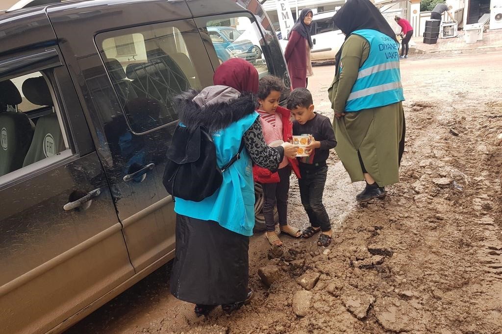 Afetin yaşandığı ilk andan itibaren mağdurların yaralarını sarmak için Türkiye Diyanet Vakfı’nın görevli ve gönüllüleriyle sahada olduğu bilgisini veren Genel Müdür Turan, “Kumluca’da yaşanan selin hemen ardından ihtiyaç duyulan noktalara görevli ve gönüllülerimiz intikal etti. Antalya İl Müftüsü ve Vakfımız Şube Başkanı Nazif Fethi Yalçınkaya’nın öncülüğündeki ekip arkadaşlarımız, selzedelere gece gündüz demeden ihtiyaç duyulan halı, kilim, kıyafet ve gıda malzemesi gibi yardımları ulaştırmaya başladı. Mağdur kardeşlerimizin beslenme ihtiyacını karşılamak için farklı noktalarda günde iki öğün bin kişilik sıcak yemek dağıtımı yapıyoruz” dedi.