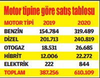 Otomobil pazarı motor hacmine göre; geçen yıl 1600cc altındaki otomobil satışları yüzde 57,5 artarak yüzde 94,3 paya ulaşırken, 1600-2000cc aralığındaki otomobil satışları yüzde 21,1 artarak yüzde 1,7 pay ve 2000cc üstü otomobil satışları yüzde 5,7 artarak yüzde 0,2 pay aldı. Hafif ticari araç pazarında ise gövde tipine göre değerlendirildiğinde, van gövde tipi yüzde 76,9 pay ve 125 bin 38 adetle en çok tercih edilen gövde tipi oldu. Kamyonet gövde tipi yüzde 11,5 pay ve 18 bin 708 adetle ikinci ve pickup gövde tipi de yüzde 6,7 pay ve 10 bin 972 adetle üçüncü sırada yer aldı. Otomatik şanzımanlı otomobiller; 436.208 adetle yüzde 71,5 pay alırken, manuel şanzımanlı otomobiller 173.901 adetle yüzde 28,5 pay aldı.