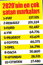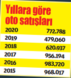 Otomotiv Distribütörleri Derneği’nin verilerine göre (ODD), Türkiye otomobil ve hafif ticari araç toplam pazarı, 2020’de bir önceki yıla göre yüzde 61,3 büyüyerek 772 bin 788 seviyesinde gerçekleşti. Otomobil satışları, 2020 yılında geçen yıla göre yüzde 57,6 oranında artarak 610.109 adet olurken, hafif ticari araç pazarı da yüzde 77,2 artarak 162.679 adede ulaştı. 2020 Aralık ayı özelinde bakıldığında ise otomobil ve hafif ticari araç pazarı yüzde 15,2, otomobil pazarı yüzde 14 ve hafif ticari araç pazarı yüzde 19,8 büyüdü. Toplam pazardaki artış, Aralık 2019 ila Aralık 2020 kıyaslandığında yüzde 15,2 olarak belirlendi. Diğer yandan, otomobil ve hafif ticari araç pazarı, 10 yıllık aralık ayı ortalama satışlarına göre yüzde 17,9 azaldı.