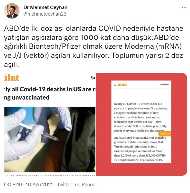 Dünyada en yaygın olarak kullanılan 2 kovid aşı firması AstraZeneca ve Pfizer-Biontech de, 2021’de aşılar piyasaya sürüldüğünde “Koronavirüs bulaşmasını ve hastalığın yayılmasını yüzde 90'ını üzerinden önlüyor” demişti.