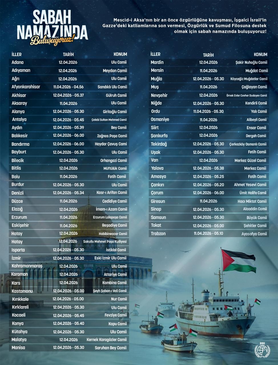 İHH İnsani Yardım Vakfı öncülüğünde, başta İstanbul olmak üzere Türkiye genelindeki 53 ilde, Filistin’e destek amacıyla sabah namazında buluşma gerçekleştirilecek. Program kapsamında bazı illerde buluşmalar cumartesi günü yapılırken, bazı illerde ise pazar günü sabah namazında gerçekleştirilecek.