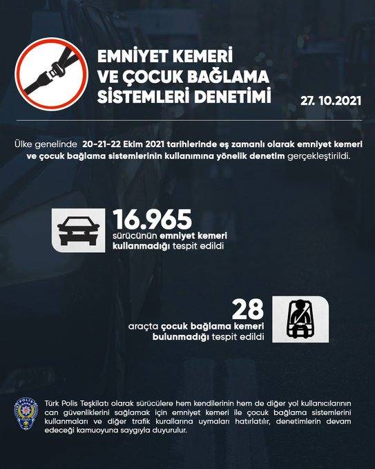 Ülke genelindeki 20-21-22 ekim tarihlerinde eşzamanlı yapılan emniyet kemeri ve çocuk bağlama sistemlerinin kullanımına yönelik denetim de ise 16 bin 965 sürücünün emniyet kemeri kullanmadığı, 28 araçta ise çocuk bağlama kemerinin bulunmadığı tespit edildi.