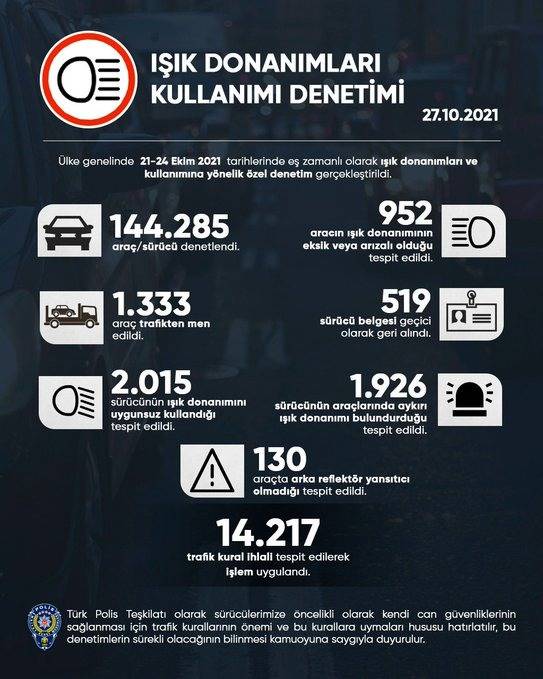 Ülke genelinde 20-24 Ekim 2021 tarihleri arasında yapılan trafik denetimlerinde 144 bin 285 araç denetimden geçti. Bunlardan bin 333’ü trafikten men edildi. 2 bin 015 aracın sürücüsünün ışık donanımlarını uygunsuz kullandığı tespit edildi. 952 aracın ışık donanımlarının eksik veya arızalı olduğu tespit edildi.