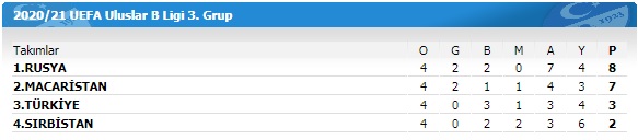 UEFA Uluslar Ligi B Grubu 3. hafta maçında Türkiye Rusya ve Macaristan ile karşı karşıya gelecek. Türkiye 3. hafta ilk maçında 15 Kasım'da Rusya ile karşılaşacak. Ülker Stadı'nda oynanacak maç saat 20.00'de başlayacak. Müsabaka TRT 1 ekranlarından yayınlanacak.