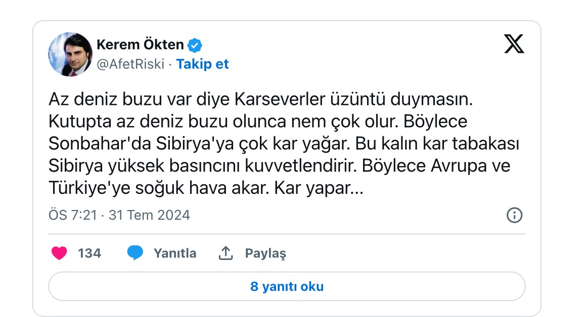 "Az deniz buzu var diye Karseverler üzüntü duymasın. Kutupta az deniz buzu olunca nem çok olur. Böylece Sonbahar'da Sibirya'ya çok kar yağar. Bu kalın kar tabakası Sibirya yüksek basıncını kuvvetlendirir. Böylece Avrupa ve Türkiye'ye soğuk hava akar. Kar yapar..."