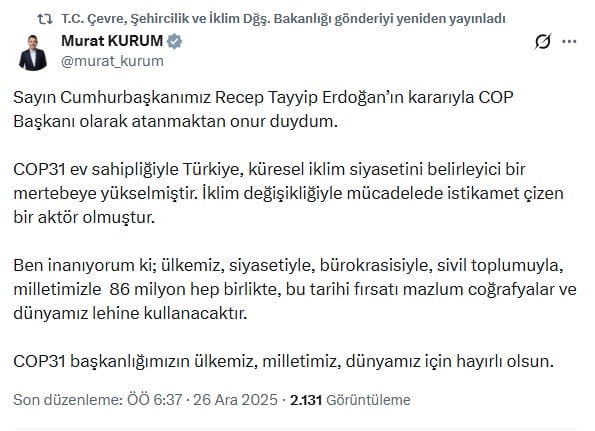 Cumhurbaşkanı Recep Tayyip Erdoğan'ın kararıyla COP Başkanı olarak atanan Çevre, Şehircilik ve İklim Değişikliği Bakanı Murat Kurum, sanal medya hesabından yaptığı paylaşımda, "Sayın Cumhurbaşkanımız Recep Tayyip Erdoğan'ın kararıyla COP Başkanı olarak atanmaktan onur duydum. COP31 ev sahipliğiyle Türkiye, küresel iklim siyasetini belirleyici bir mertebeye yükselmiştir. İklim değişikliğiyle mücadelede istikamet çizen bir aktör olmuştur. Ben inanıyorum ki; ülkemiz, siyasetiyle, bürokrasisiyle, sivil toplumuyla, milletimizle 86 milyon hep birlikte, bu tarihi fırsatı mazlum coğrafyalar ve dünyamız lehine kullanacaktır. COP31 başkanlığımızın ülkemiz, milletimiz, dünyamız için hayırlı olsun" ifadelerini kullandı. (DHA)