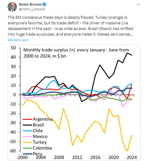 Ünlü ekonomist Robin Brooks, Brezilya ve Türkiye'nin dış ticaret verilerini karşılaştırarak dikkat çeken bir yorum yaptı.