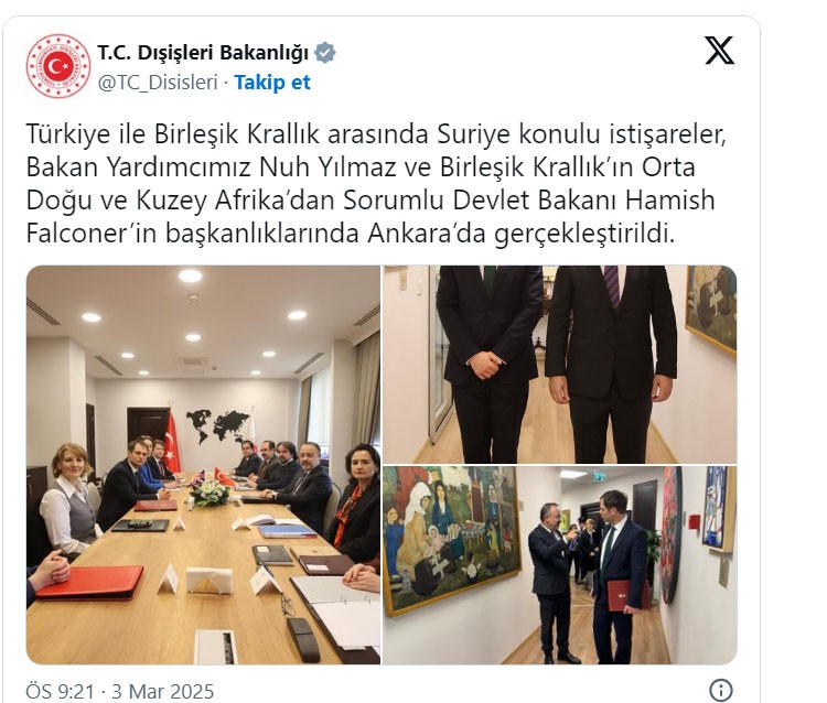 Dışişleri Bakanlığı, Ankara'da İngiltere'den gelen heyet ile Suriye konulu istişare toplantısı yapıldığını bildirdi.