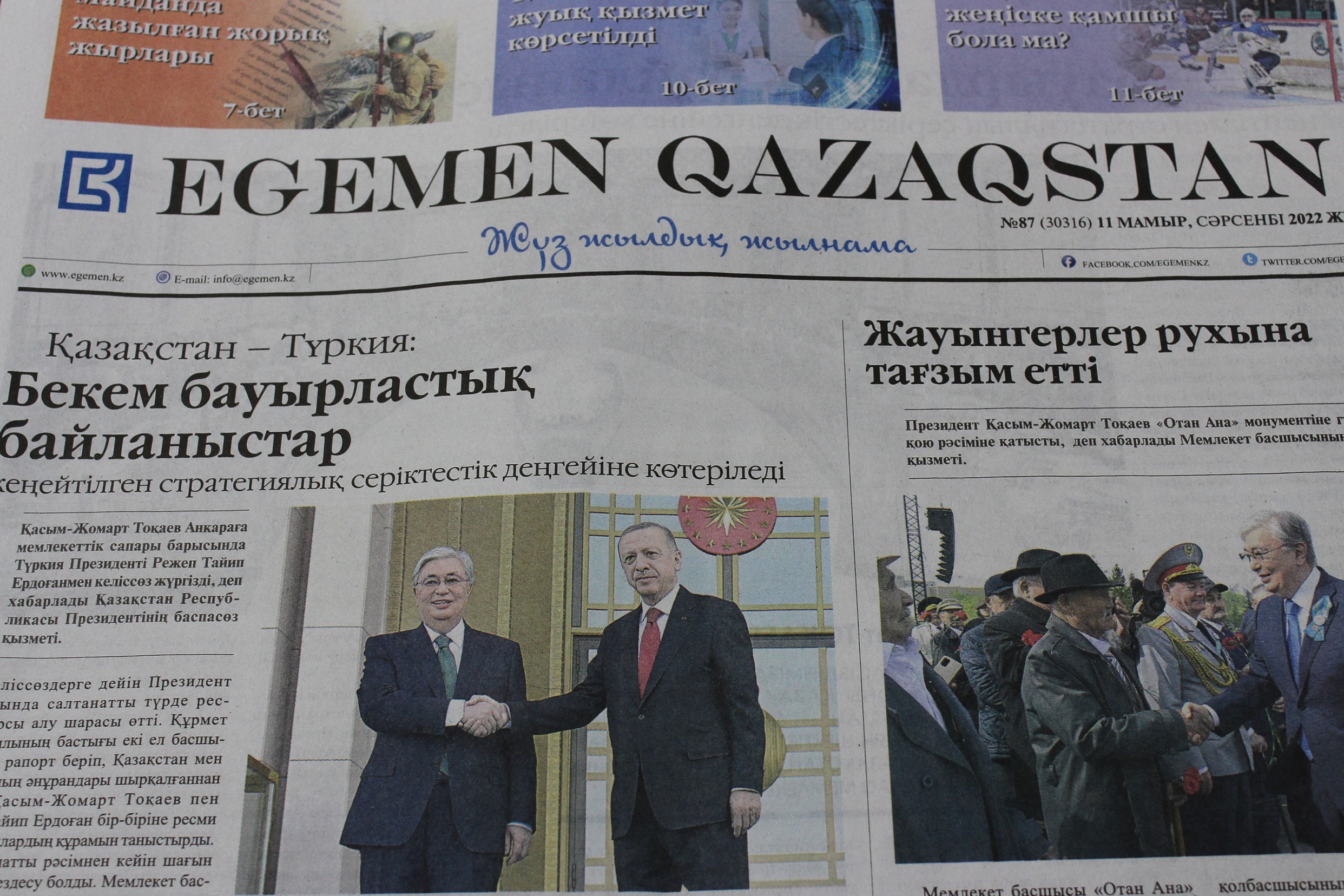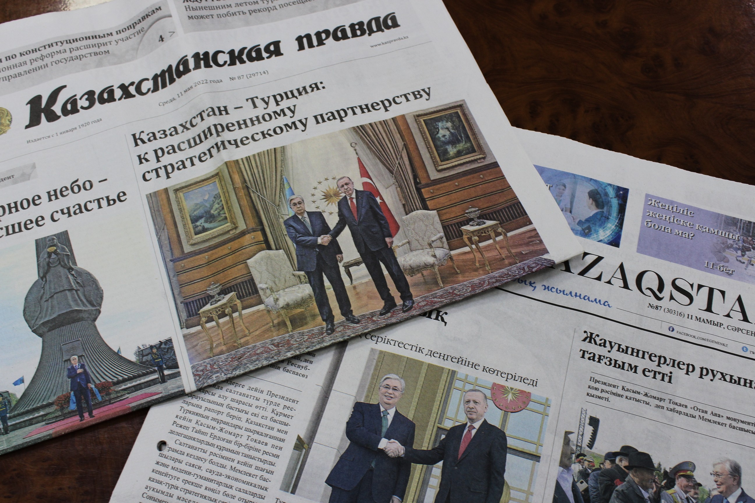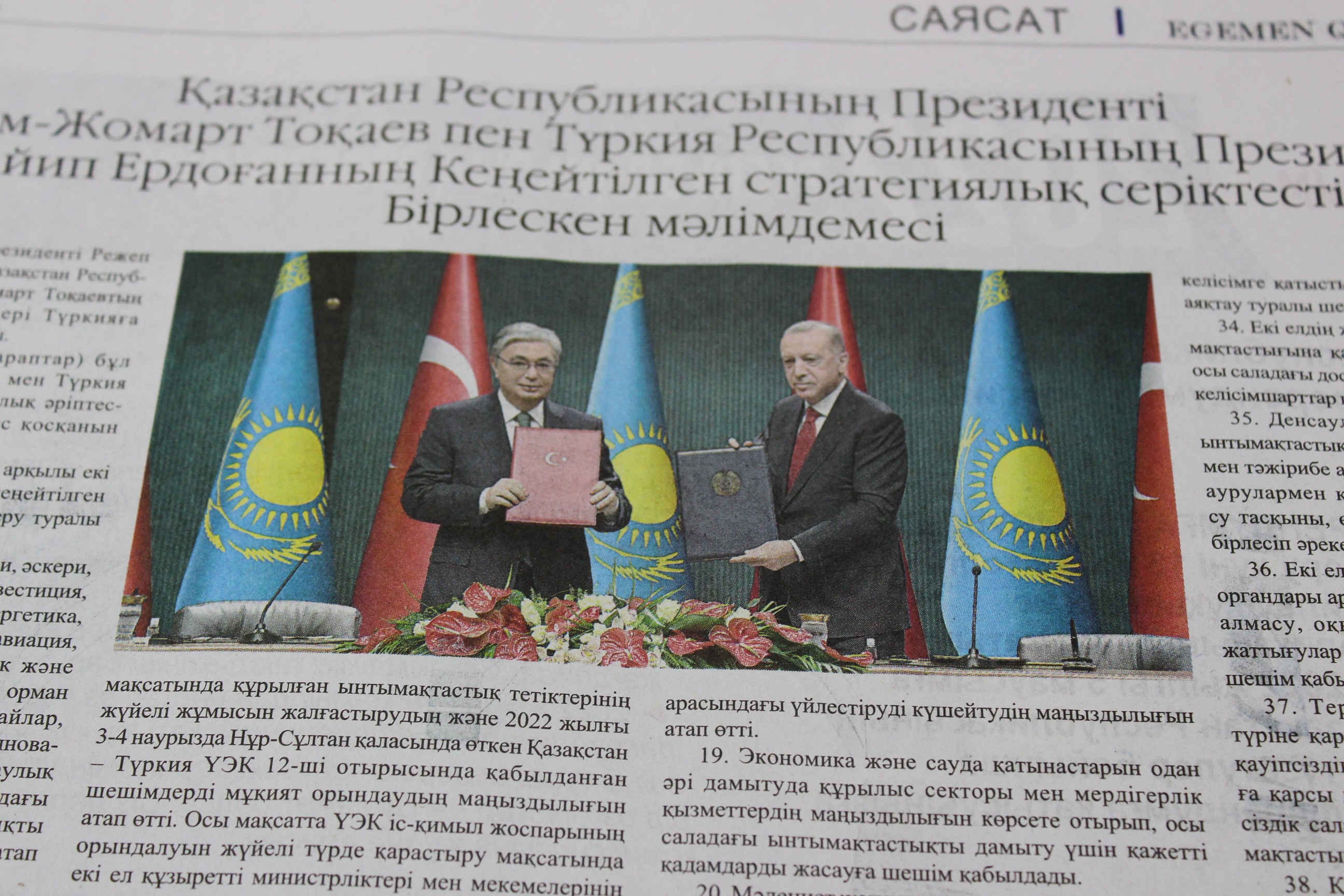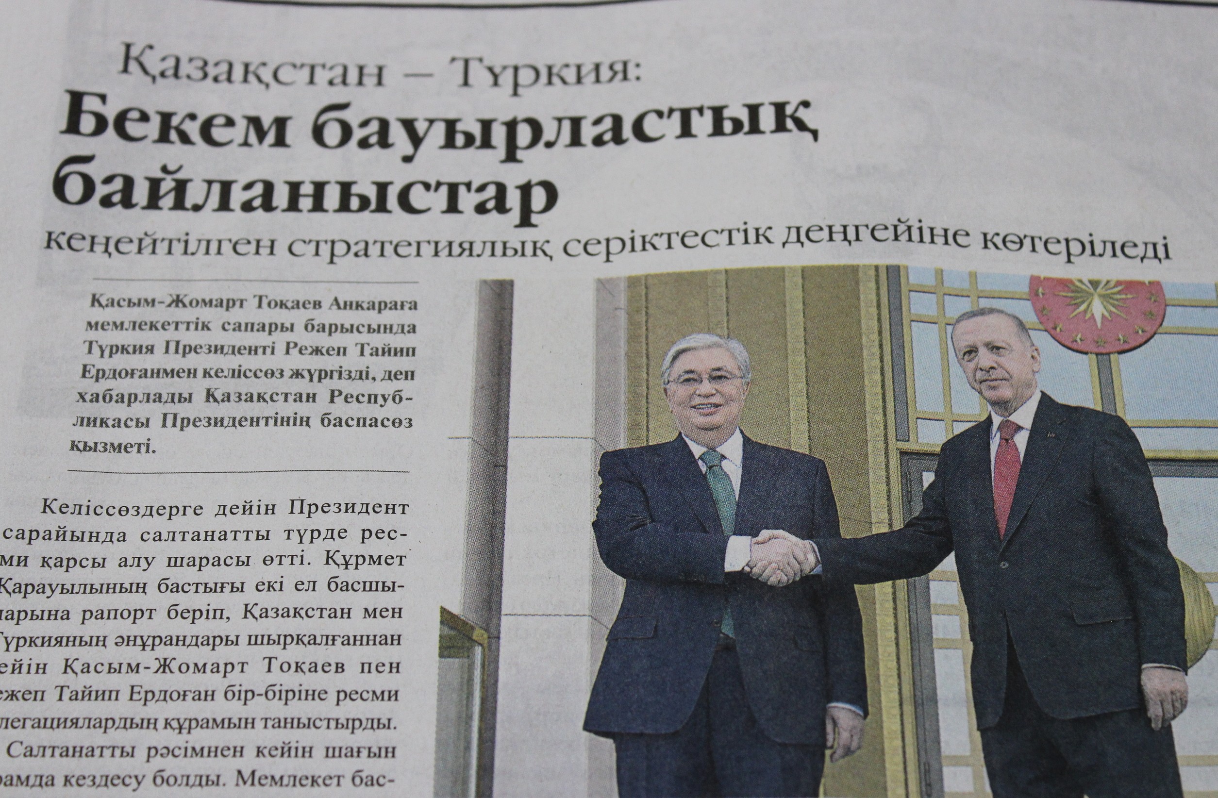 Gazetenin "Güçlü kardeşlik ilişkileri veya Kazakistan ile Türkiye ilişkileri geliştirilmiş stratejik ortaklık düzeyine yükseltildi" başlığıyla yayımladığı haberde, Tokayev ile Erdoğan'ın, Ankara'da ikili ilişkileri "geliştirilmiş stratejik ortaklık" düzeyine çıkarma kararı aldıkları belirtildi.