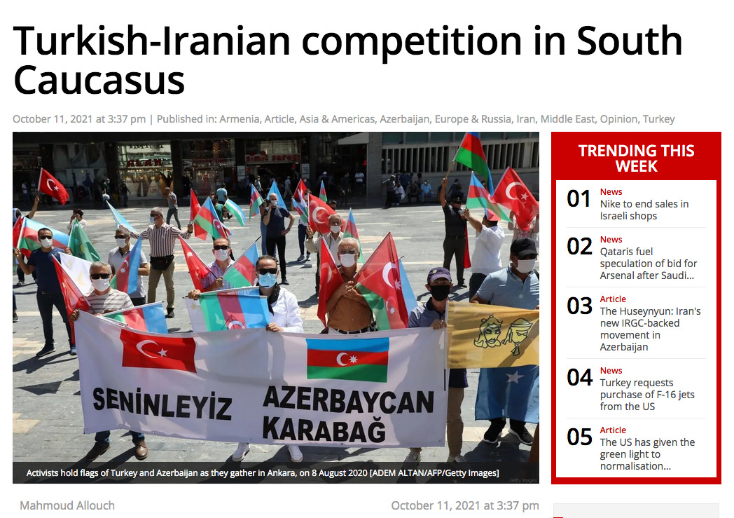 Londra merkezli haber sitesi Middle East Monitor’de Türk-İran rekabetinin seyrine ilişkin yayınlanan yazıda, “Kafkasya'da Tahran ve Ankara arasındaki bölgesel rekabetin diğer birçok alanda olduğu gibi sona ermesi olası değil” denildi.