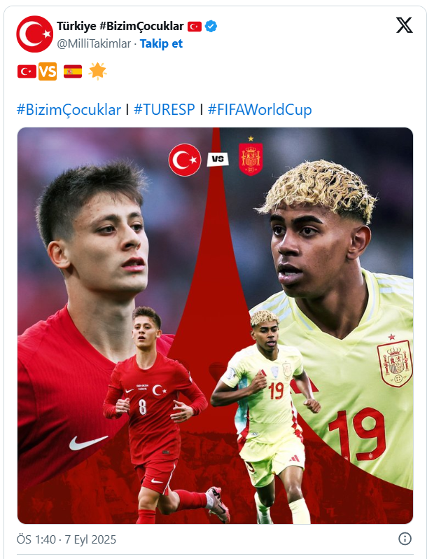 2026 Dünya Kupası Elemeleri E Grubu mücadelesinde Türkiye, 7 Eylül 2025 Pazar günü saat 21:45’te Konya Büyükşehir Belediye Stadyumu’nda İspanya ile karşı karşıya gelecek. Gürcistan deplasmanında 3-2’lik galibiyetle moral bulan A Millî Takım, İspanya karşısında da sahadan galibiyetle ayrılmayı hedefliyor. Real Madrid’in yıldızı Arda Güler ile Barcelona’nın genç yeteneği Lamine Yamal, Konya’da karşı karşıya gelecek.