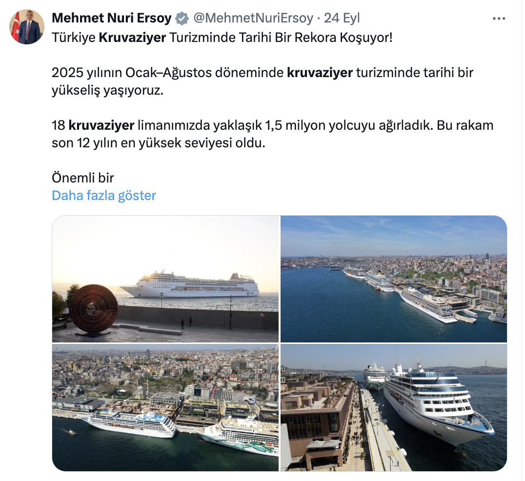 Kültür ve Turizm Bakanı Mehmet Nuri Ersoy, kruvaziyer turizminde ulaşılan tarihi başarıyı x sosyal medya hesabından duyurdu. Sefer sayısı, yolcu sayısı, gelir miktarında rekor kırıldı.
