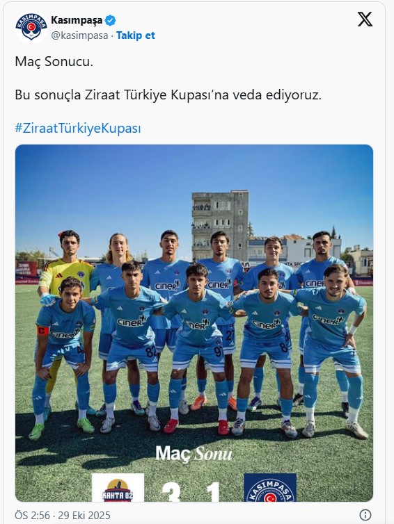 Ziraat Türkiye Kupası 3. Tur maçlarında beklenmedik bir sonuç ortaya çıktı. Süper Lig ekibi Kasımpaşa SK, Bölgesel Amatör Lig takımı Kahta 02 Spor'a mağlup oldu ve turnuvaya veda etti.