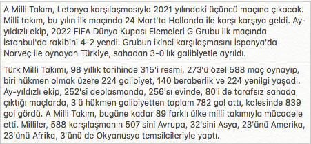 A Milli Takımımızın Letonya ile 30 Mart Salı günü Atatürk Olimpiyat Stadı’nda oynayacağı 2022 FIFA Dünya Kupası Avrupa Elemeleri G Grubu maçının biletleri bugün saat 15.00’te satışa çıkıyor. A Milli Futbol Takımı'nın 2022 FIFA Dünya Kupası Avrupa Elemeleri G Grubu'nda yarın yapacağı ve yüzde 15 seyirci alınacak Letonya maçının biletleri bugün satışa çıktı.