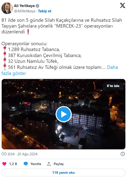 İçişleri Bakanı Ali Yerlikaya, sosyal medya hesabından yaptığı açıklamada, son 5 günde silah kaçakçılarına ve ruhsatsız silah taşıyanlara yönelik 81 ilde "Mercek-23" operasyonları düzenlendiğini belirtti.