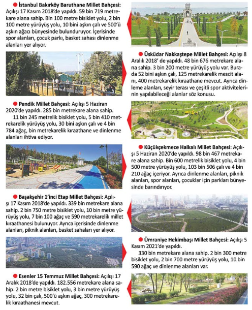 Bunlarla beraber 39 bin 870 metrekarelik Bayrampaşa Millet Bahçesi, 215 bin 178 metrekarelik Samandıra Aydos Ormanı Millet Bahçesi, 20 bin metrekarelik Güngören Güneştepe Millet Bahçesi, 173 bin 252 metrekarelik İstanbul Beşiktaş Millet Bahçesi, 275 bin metrekarelik Sancaktepe Samandıra Millet Bahçesi, 37 bin 381 Silivri Millet Bahçesi, 75 bin 660 metrekarelik Üsküdar Çocuk Köyü Millet Bahçesi’nin de yapımı tamamlanınca vatandaşlara nefes aldıracak.