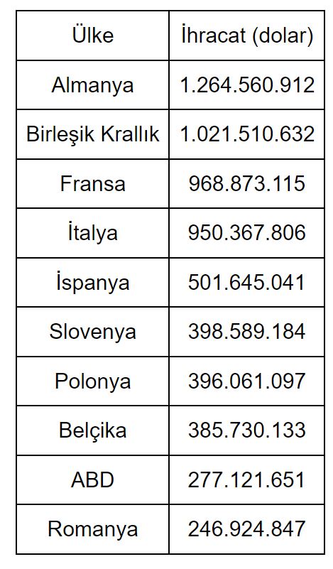 Türkiye otomotiv endüstrisinin yılın ilk 3 ayındaki ihracatının 6 milyar 108 milyon 213 bin dolarla yüzde 66,9'u Avrupa Birliği (AB) ülkelerine oldu. Almanya en çok ihracat yapılan ülke oldu.