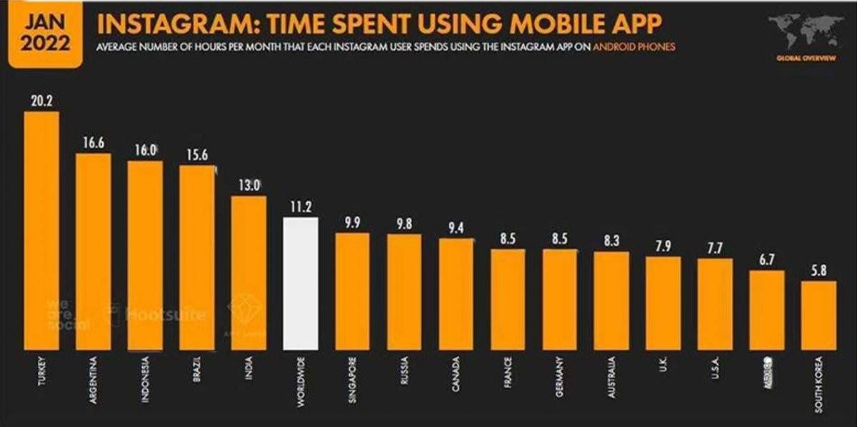Instagram kullanıcılarının uygulamada ne kadar vakit geçirdiğini analiz eden ünlü sosyal medya yönetim platformu Hootsuite, 2022 yılının Ocak ayında dünya çapındaki verileri yayınladı.