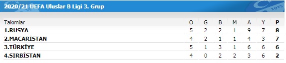 Türkiye, UEFA Uluslar B Ligi 3 Grup’ta yer alıyor. Milli Takım son olarak evinde Rusya ile karşı karşıya geldi. İşte, puan durumu: