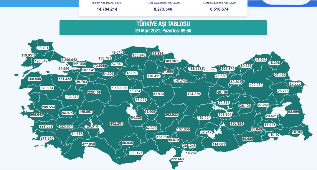 İllerin her 100 bin kişide haftalık (13-19 Mart) Kovid-19 vaka sayısı şöyle: "Şırnak (8,18), Siirt (14,2), Hakkari (15,69), Mardin (17,08), Şanlıurfa (18,3), Diyarbakır (18,78), Uşak (19,49), Muş (21,16), Bitlis (23,08), Van (27,41), Batman (28,54), Kars (30,53), Ağrı (41,46), Afyon (47,36), Bingöl (47,56), Denizli (49,38), Sivas (55,83), Kırşehir (61,31), Adana (61,58), Hatay (61,77), Tunceli (63,52), Manisa (64,66), Kahramanmaraş (67,37), Aydın (69,07), Burdur (72,26), Erzurum (72,4), Kırıkkale (73,91), Bayburt (74,47), Isparta (74,49), Bartın (76,89), Nevşehir (79,35), Elazığ (80,11), Mersin (80,7), Zonguldak (81,02), Karabük (84,15), Ardahan (86,31), Gaziantep (87,33), Karaman (89,44), Muğla (92,33), Yozgat (92,82), Düzce (95,28), Bursa (97,14), Bolu (100,38), Niğde (104,4), Gümüşhane (105,15), Iğdır (107,3), Ankara (107,99), Kütahya (111,33), İzmir (111,41), Artvin (113,86), Bilecik (114,3), Eskişehir (116,56), Antalya (119,18), Çankırı (122,64), Erzincan (124,13), Sakarya (124,49), Çorum (138,65), Malatya (140,54), Kırklareli (155,09), Tekirdağ (168,26), Adıyaman (169,81), Kocaeli (176,39), Amasya (194,04), Kayseri (196,07), Kastamonu (197,41), Osmaniye (198,52), Rize (202,41), Çanakkale (202,75), Aksaray (214,42), Edirne (219,49), Trabzon (246,95), Tokat (248,72), İstanbul (251,12), Konya (252,18), Kilis (258,42), Ordu (258,87), Yalova (275,31), Balıkesir (288,16), Sinop (309,06), Giresun (356,35), Samsun (508,97)."