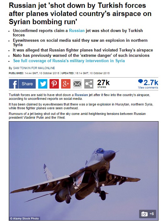 İngiltere'nin önemli yayın kuruluşlarından Daily Mail gazetesi, Türkiye’nin havasahasına giren bir Rus jetini düşürdüğünü öne sürdü.