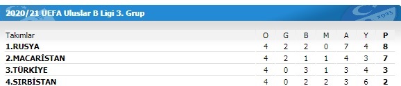 Üçüncü grupta, beşinci maçlar öncesinde Rusya 8 puanla lider durumda bulunuyor. İkinci sıradaki Macaristan ise 7 puana sahip. Grupta Türkiye 3 puanla üçüncü, Sırbistan ise 2 puanla son sırada bulunuyor.