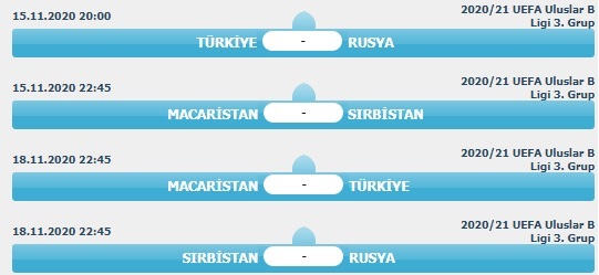 UEFA Uluslar B Ligi 3. Grup beşinci maçında Türkiye ile Rusya 15 Kasım Pazar günü karşı karşıya gelecek. Ülker Stadı'nda oynanacak maç saat 20.00'de başlayacak. Müsabaka TRT 1 ekranlarından yayınlanacak. Zorlu karşılaşmayı Polonya Futbol Federasyonundan hakem Szymon Marciniak yönetecek.