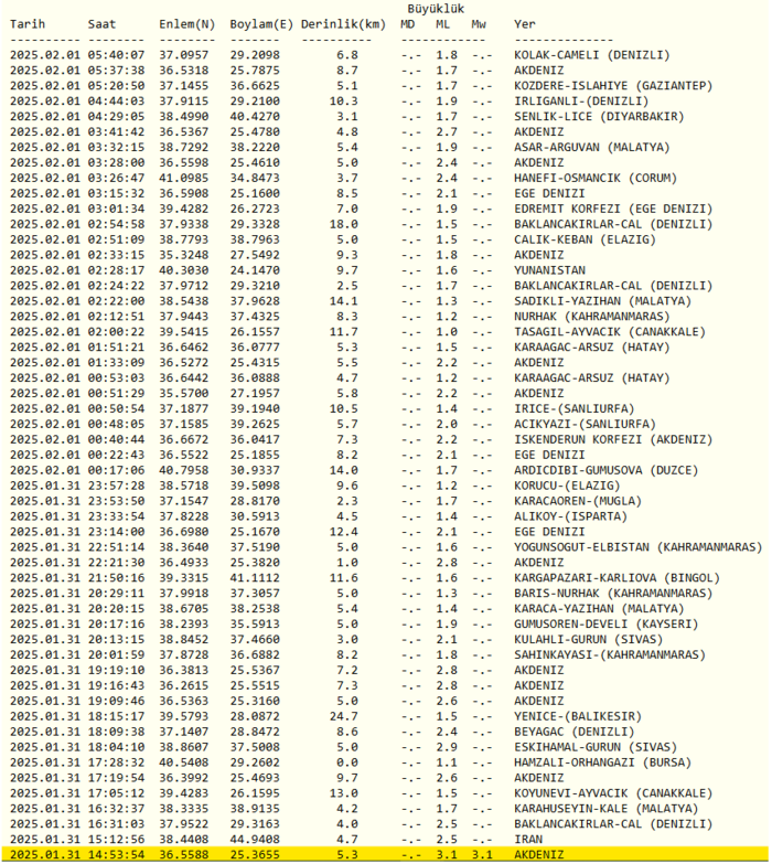 1 ŞUBAT'TA MEYDANA GELEN DEPREMLER