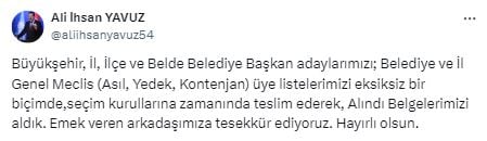 “Büyükşehir, il, ilçe ve belde belediye başkan adaylarımızı; belediye ve il genel meclis (asıl, yedek, kontenjan) üye listelerimizi eksiksiz bir biçimde seçim kurullarına zamanında teslim ederek, alındı belgelerimizi aldık. Emek veren arkadaşımıza tesekkür ediyoruz. Hayırlı olsun”