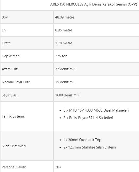 Milli imkanlarla Ares Shipyard tarafından geliştirilen ARES 150 HERCULES; 48 metre boya, 37 deniz mili azami sürate ve 1600 deniz mili seyir siasına sahip. Geminin üzerinde, konvansiyonel ve asimetrik tehditlere karşı kullanılmak için elektro-optik sensörler ile 30mm’lik MUHAFIZ Uzaktan Komutalı Stabilize Top ve 2 adet 12.7mm STAMP Uzaktan Komutalı Stabilize Silah Sistemleri bulunuyor.
